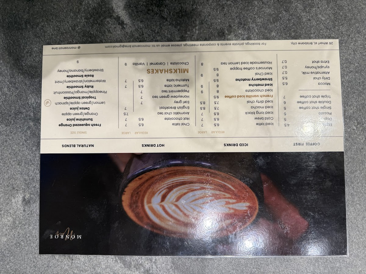 The Iced Drinks category offers a variety of cold coffee beverages and flavored iced coffees. Options include Iced Latte, Cold Brew, Iced Long Black, Iced Mocha, and specialty iced drinks such as French Vanilla Iced Coffee, Iced Chocolate, Iced Matcha, Iced Chai, and Monroe's Coffee Frappe. These selections provide refreshing alternatives, especially during warmer weather or for those preferring chilled beverages.