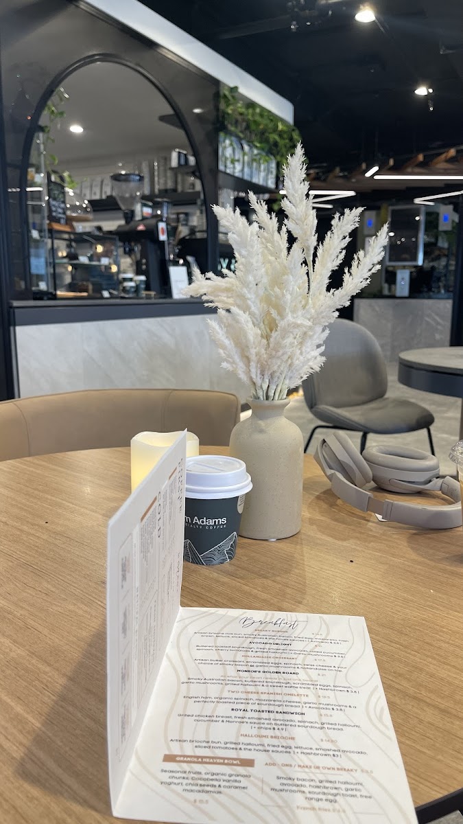 In addition to the listed items, the menu includes specialty coffee options such as Flat White, Long Black Coffee, Batch Brewed Coffee, and Omelette dishes. Customers often use the menu for convenient ordering, including options to pre-order via text, making it suitable for those with limited time during work breaks or casual dining occasions.